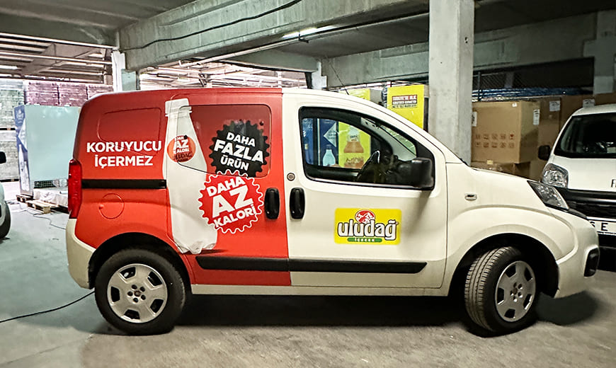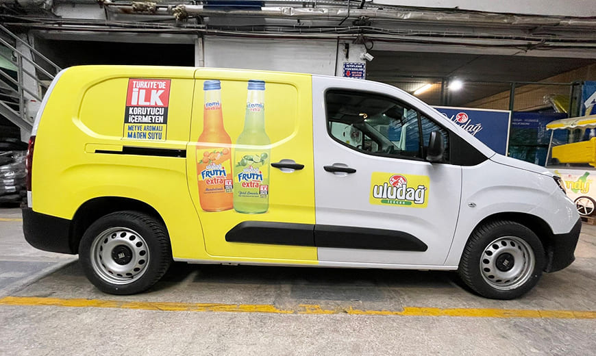 Araç giydirme çalışmaları, firmaların marka bilinirliğini artıran en etkili reklam yöntemlerinden biridir. Bu uygulama sayesinde Uludağ İçecek dağıtım araçları şehir içerisinde hareket ederken güçlü bir reklam ve tanıtım aracı haline gelmiştir.