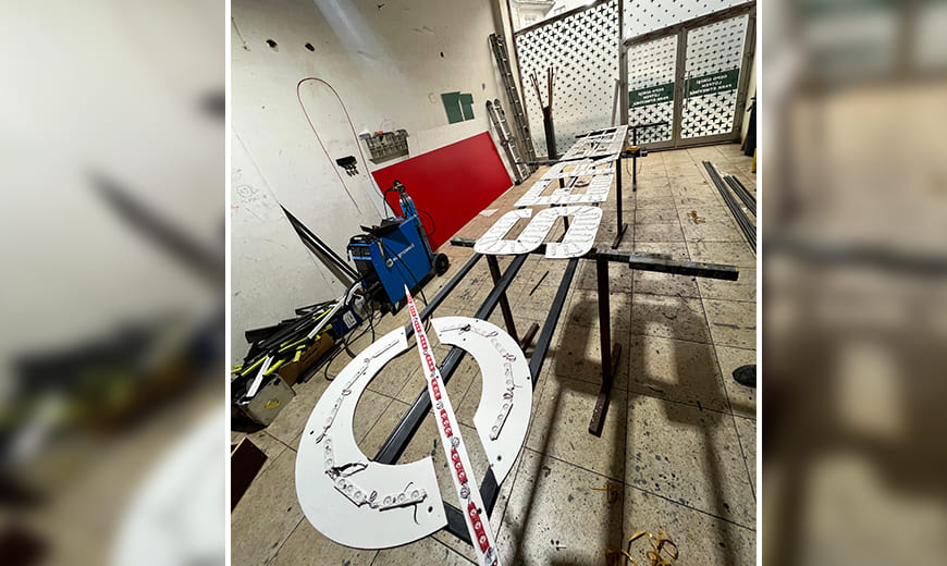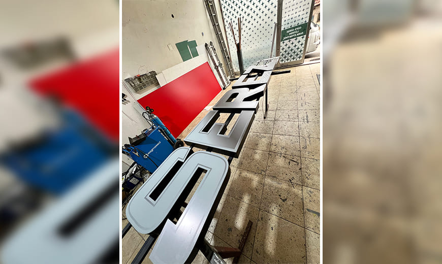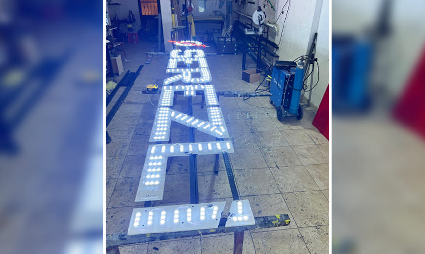 Kutu harflerin yan bantları dayanıklı alüminyum malzeme kullanılarak hazırlanmıştır. Harflerin üretim sürecinde LED aydınlatma sistemi döşenmiş ve ardından harf montajları tamamlanarak ışıklı tabela sistemi hazır hale getirilmiştir.