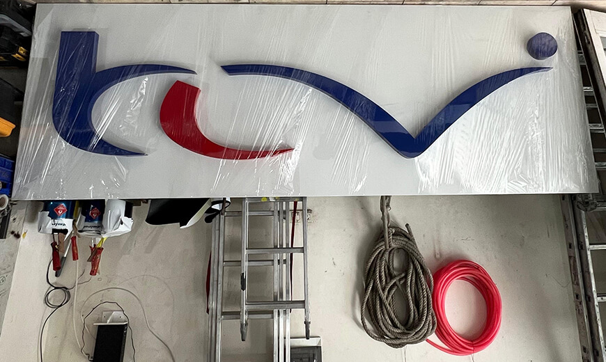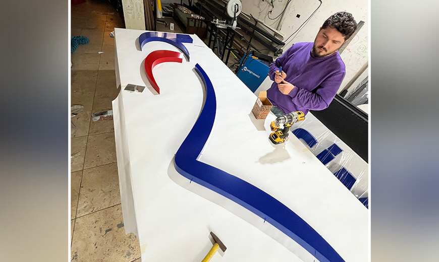 Kompozit zemin uygulaması hem dayanıklılık hem de görsel bütünlük sağlayarak tabela sisteminin daha güçlü ve dikkat çekici görünmesini sağlamaktadır.