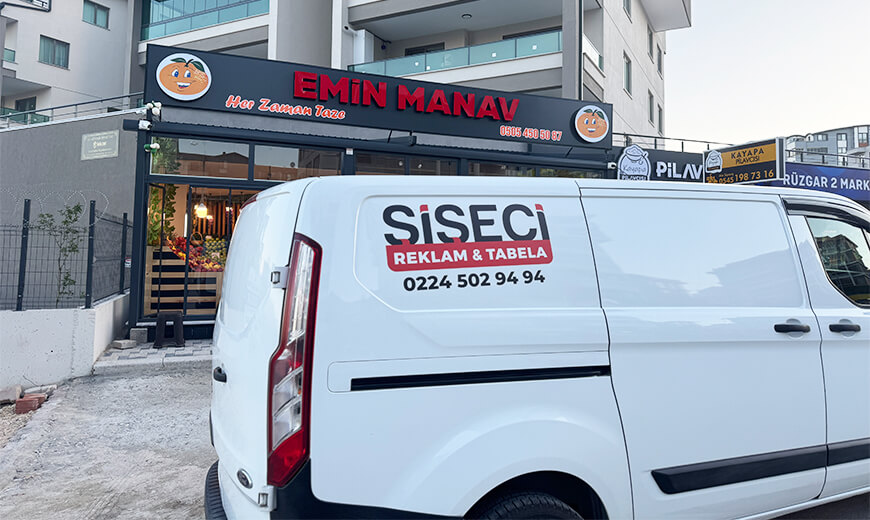 Bursa’da faaliyet gösteren Emin Manav işletmesi için hazırlanan cephe tabela uygulaması, Şişeci Reklam tarafından tasarlanmış, üretilmiş ve montajı gerçekleştirilmiştir. İşletmenin marka görünürlüğünü artırmak ve modern bir mağaza cephesi oluşturmak amacıyla profesyonel tabela sistemleri kullanılarak estetik bir çalışma hazırlanmıştır.